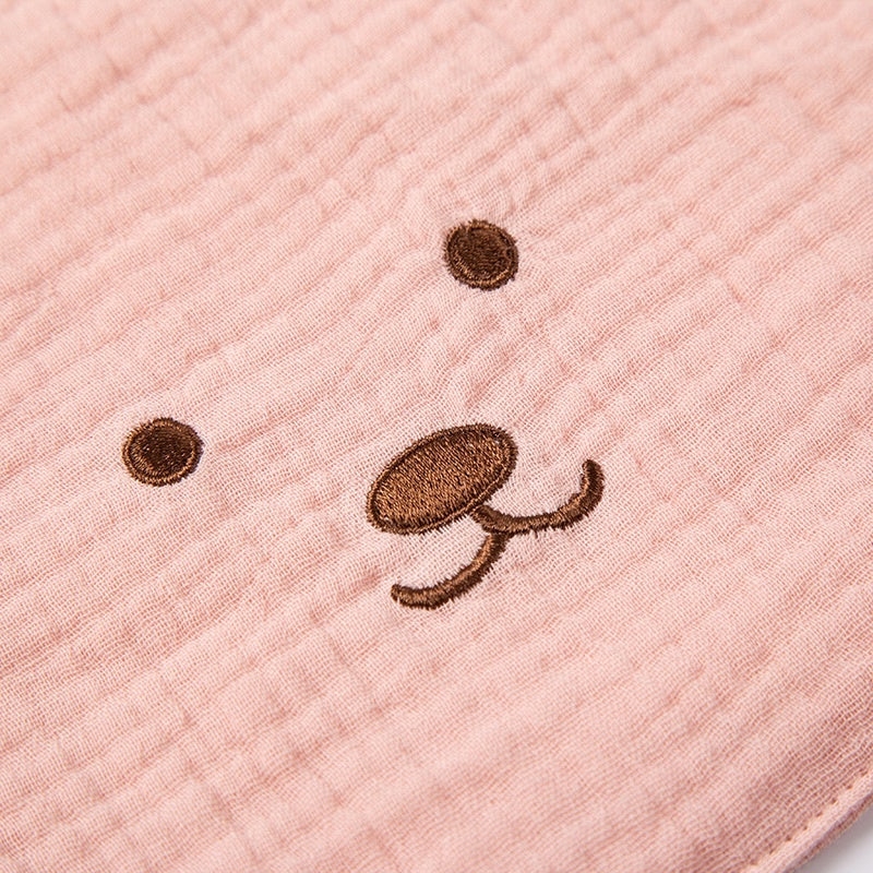 This bib has 6 layers of soft cotton gauze, perfect for your baby’s delicate skin. The design is embroidered into the fabric. It also has 2 snaps that makes it adjustable.